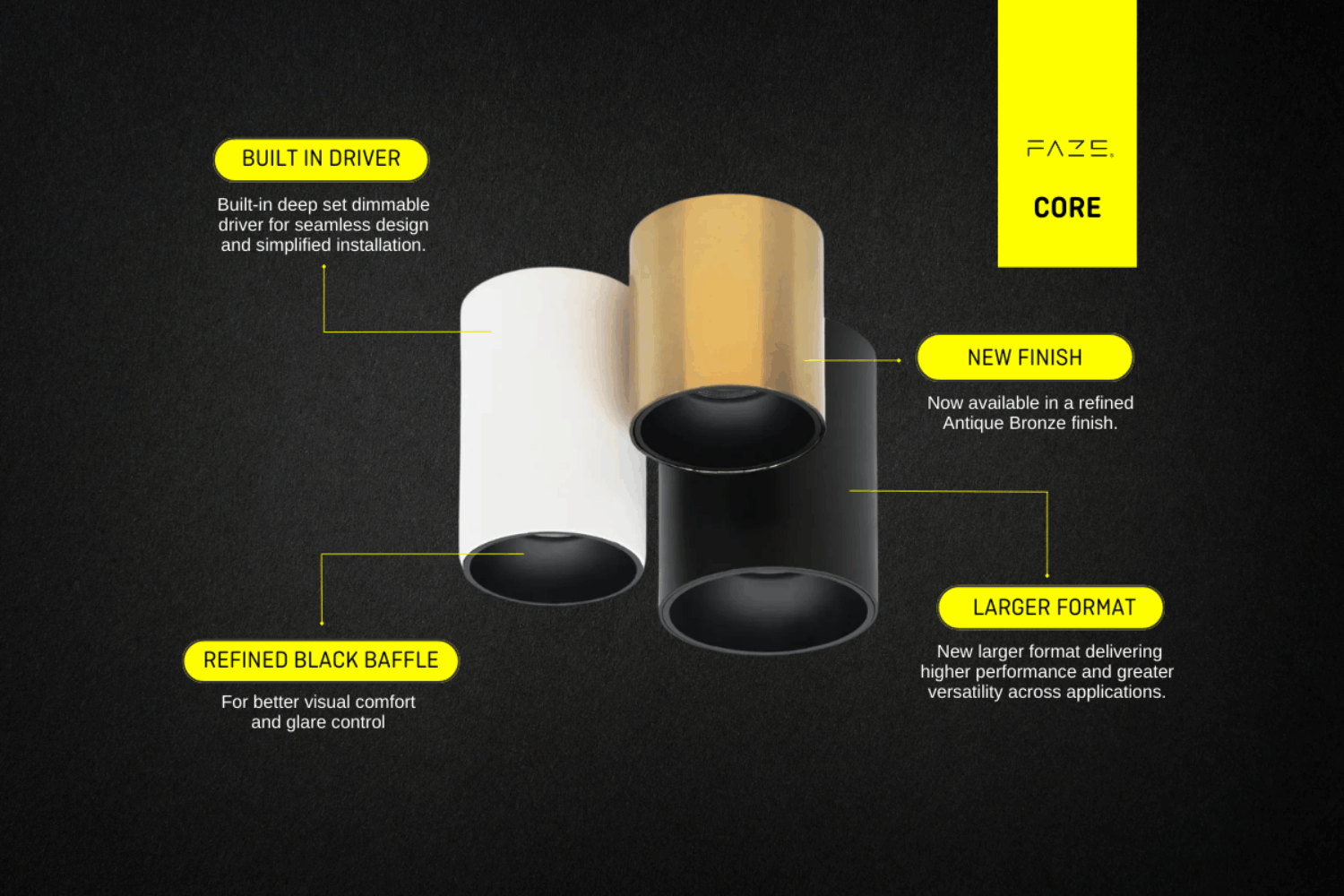The Core Series now introduces a new Antique Bronze finish, while the addition of the Core XL brings increased output and enhanced flexibility to the family with a wider range of size options.